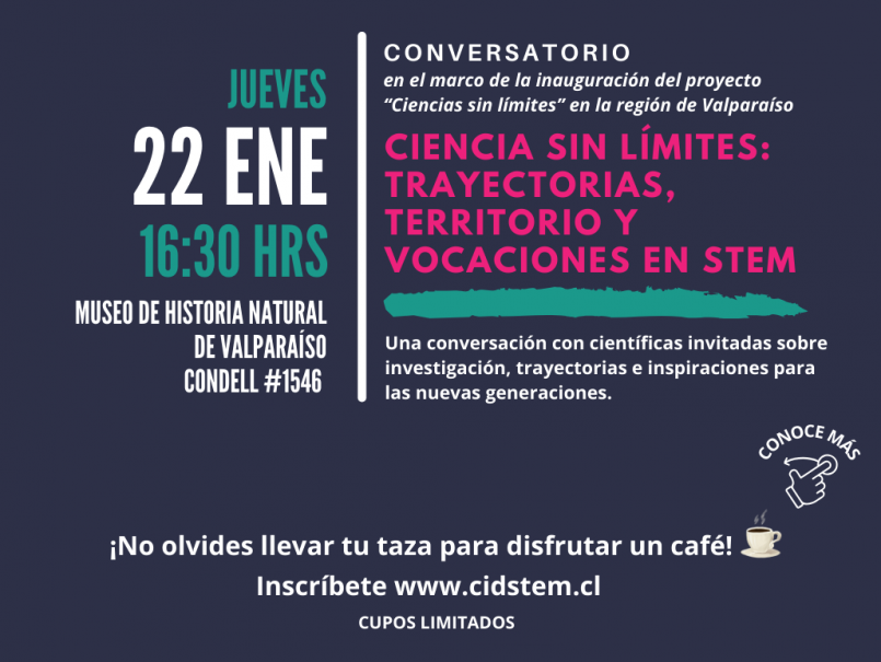 El 15° Conversatorio del Café STEAM Valparaíso, bajo el título “Ciencia sin límites: Trayectorias, territorios y vocaciones en STEM”, se realizará el jueves 22 de enero, a las 16.30 horas en el Museo de Historia Natural de Valparaíso (Condell 1546, Valparaíso) en formato de diálogo abierto y cercano, propiciando un espacio de diálogo entre las expositoras.