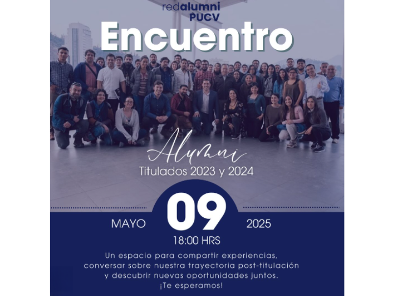 La Red Alumni PUCV invita a las y los titulados de los años 2023 y 2024 a participar en un encuentro de camaradería que se realizará el viernes 9 de mayo, a las 18.00 horas en Casa Central.