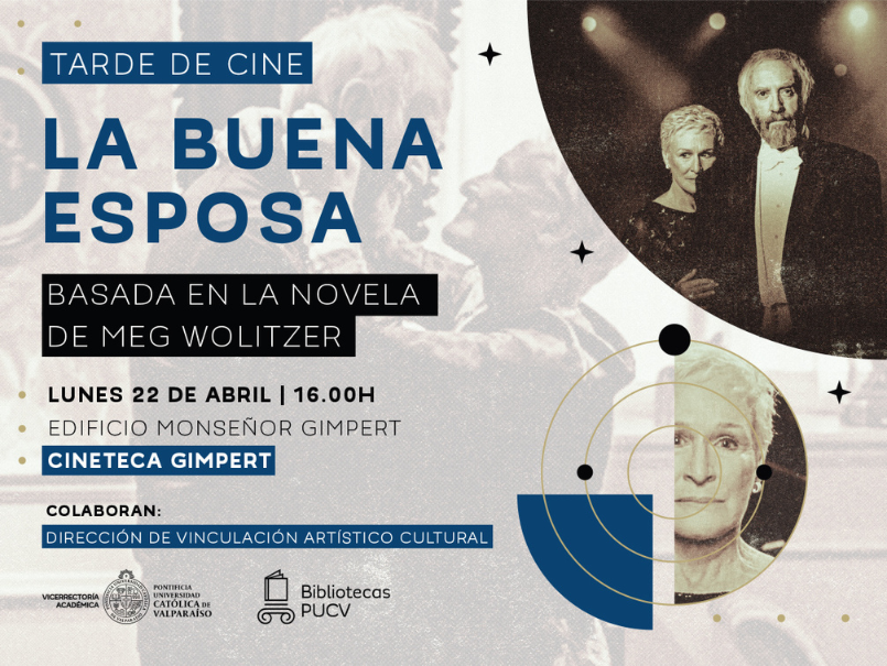 Bibliotecas PUCV, en el marco de las actividades del Mes del Libro y en colaboración con la Dirección de Vinculación Artístico Cultural, invita a la comunidad universitaria a formar parte de una tarde de cine para la proyección de la película "La buena esposa", actividad agendada para el día lunes 22 de abril, a las 16 horas, en nuestra Cineteca, localizada en el edificio Monseñor Gimpert.