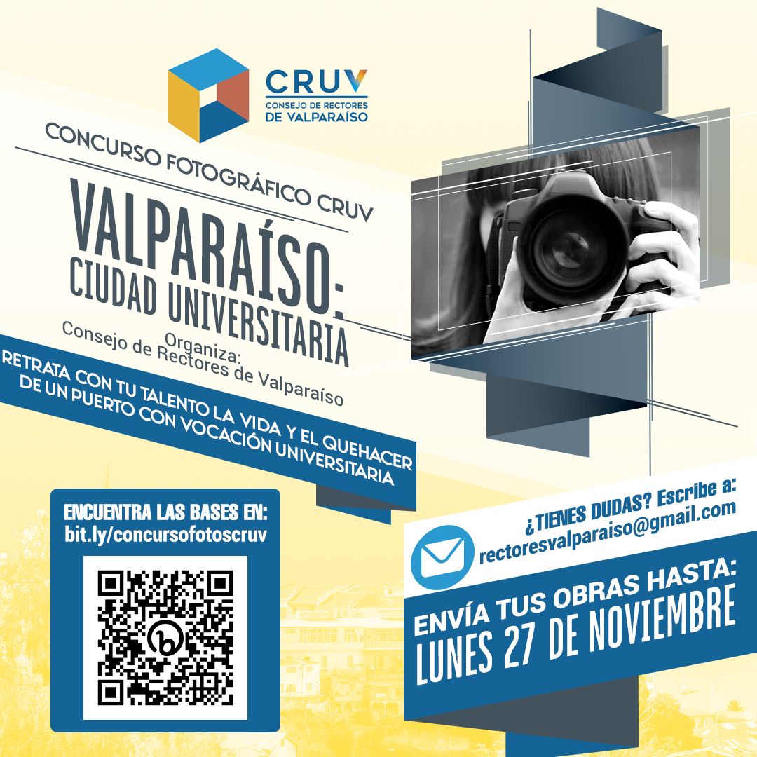 Invitamos a la comunidad universitaria a participar del concurso fotográfico "Valparaíso: ciudad universitaria", iniciativa organizada por el Consejo de Rectores de Valparaíso (CRUV), que aceptará postulaciones hasta las 23:59 horas del día lunes 27 de noviembre.
