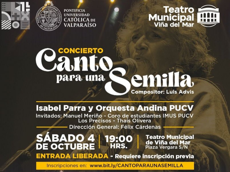 La Pontificia Universidad Católica de Valparaíso invita a conmemorar el Día de la Música Chilena con una versión renovada de “Canto para una Semilla", obra emblemática de Luis Advis inspirada en la vida y el canto de Violeta Parra a través de sus décimas.