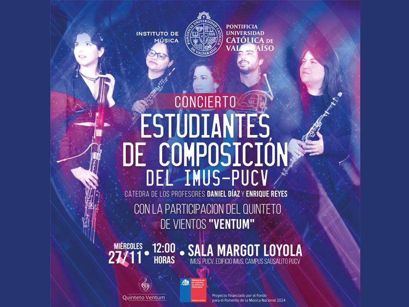 El miércoles 27 de noviembre, a partir de las 12 horas se realizará en el aula Margot Loyola del Instituto de Música en el Campus Sausalito (Avenida El Bosque 1290, Viña del Mar), el concierto de estudiantes de la Cátedra de Composición del IMUS PUCV, evento que contará con la participación del quinteto de vientos “Ventum”.