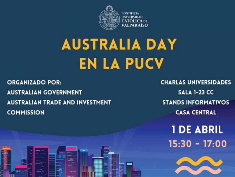 La Dirección General de Asuntos Internacionales de la PUCV informa que el próximo martes 1 de abril se efectuará en la Casa Central el Día de Australia, a partir de las 15:30 horas, ocasión en la que se recibirá a una delegación de instituciones de educación superior australianas quienes informarán sobre las posibilidades de intercambio e internacionalización. Se ofrecerán stands informativos y charlas en la sala 1-23 de Casa Central, ubicada en Av. Brasil 2950, Valparaíso.