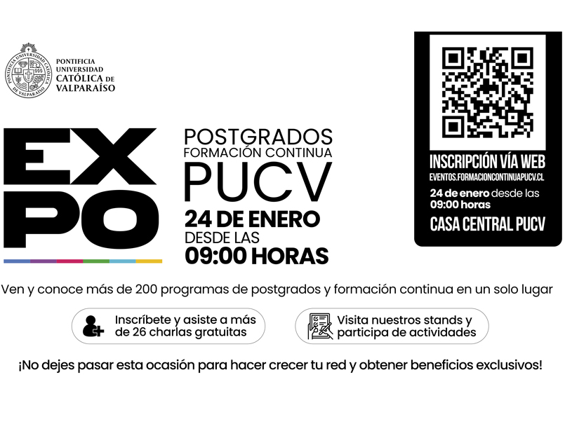 El viernes 24 de enero, a partir de las 9 horas en Casa Central (Avenida Brasil 2950, Valparaíso), se realizará la Expo Postgrados y Formación Continua PUCV.