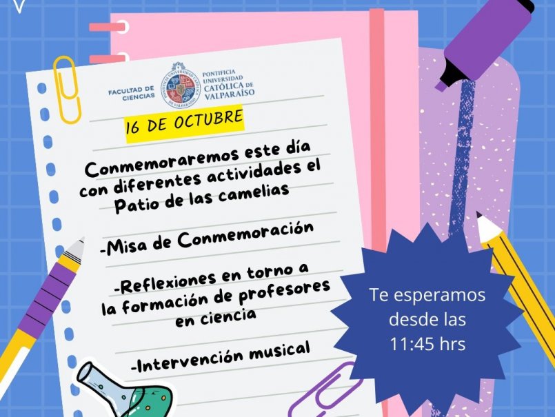 El miércoles 16 de octubre, desde las 11:45 horas, la Facultad de Ciencias conmemorará el Día del Profesor en el Campus Curauma (Av. Universidad 330, Curauma) con actividades pensadas para los estudiantes, profesores y profesoras.