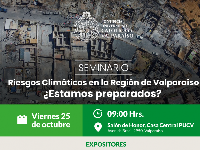 La Pontificia Universidad Católica de Valparaíso, a través de la Dirección de Vinculación Social y Sostenibilidad en conjunto con la Fundación para la Superación de la Pobreza, realizarán el Seminario: “Riesgos Climáticos en la Región de Valparaíso – ¿Estamos preparados?”, el cual se efectuará este viernes 25 de octubre a partir de las 9 horas en el Salón de Honor de Casa Central (Av. Brasil 2950, Valparaíso).