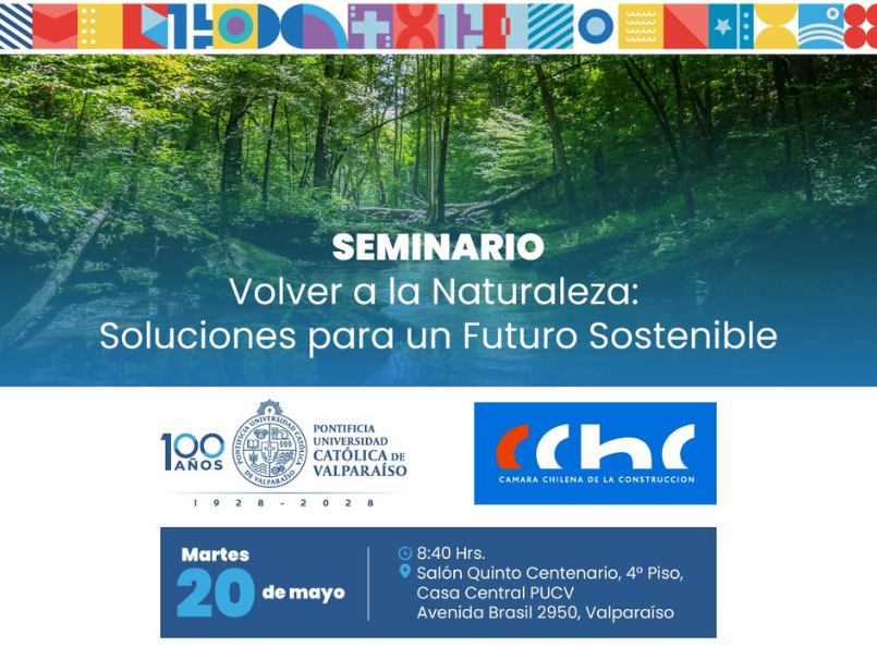 El día martes 20 de mayo, a las 8:40 horas, se llevará a cabo el seminario "Volver a la Naturaleza: Soluciones para un Futuro Sostenible", actividad que se realizará en el Salón V Centenario de Casa Central.
