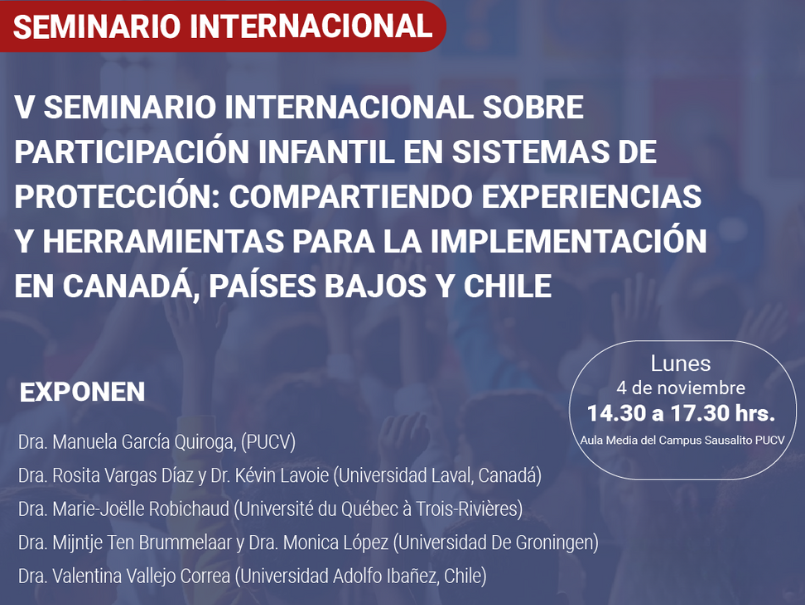 El día lunes 4 de noviembre, a las 14:30 horas, se llevará a cabo el V Seminario Internacional sobre Participación Infantil en Sistemas de Protección, evento que se realizará en la Aula Media del Campus Sausalito.