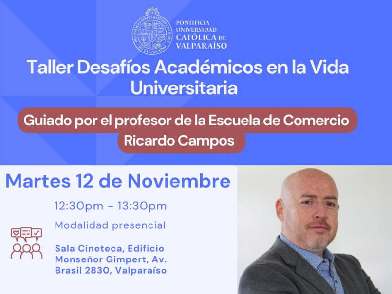 El día martes 12 de noviembre, a partir de las 12:30 horas, se llevará a cabo un taller de Acompañamiento para la Vida Universitaria titulado "Desafíos Académicos en la Vida Universitaria", el cual será impartido por el Profesor Ricardo Campos de la Escuela de Comercio.