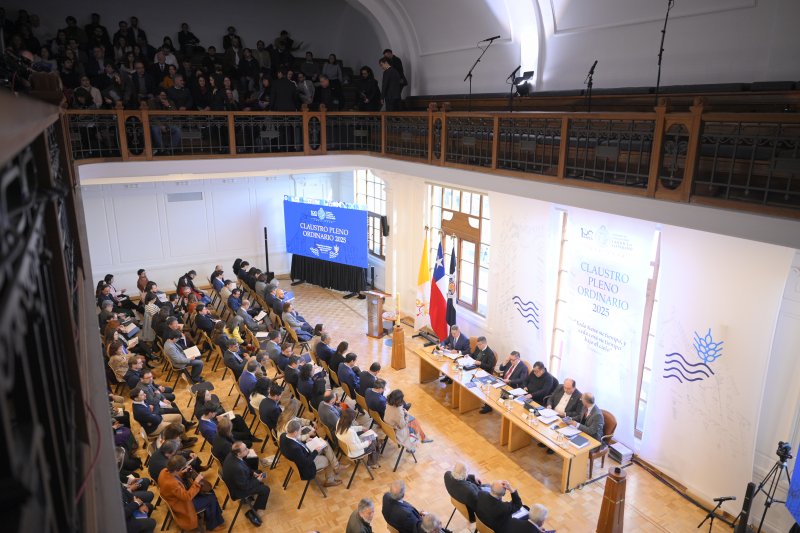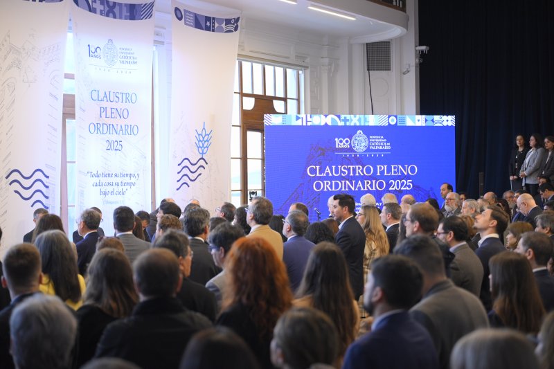 Con una puesta en escena renovada y un enfoque en el futuro, el Claustro Pleno 2025 de la PUCV reunió a académicos, académicas, investigadores, funcionarios y estudiantes en Casa Central, donde la comunidad pudo seguir la cuenta del rector Nelson Vásquez tanto en el Salón de Honor como en el auditorio Quinto Centenario. donde se transmitió en vivo.