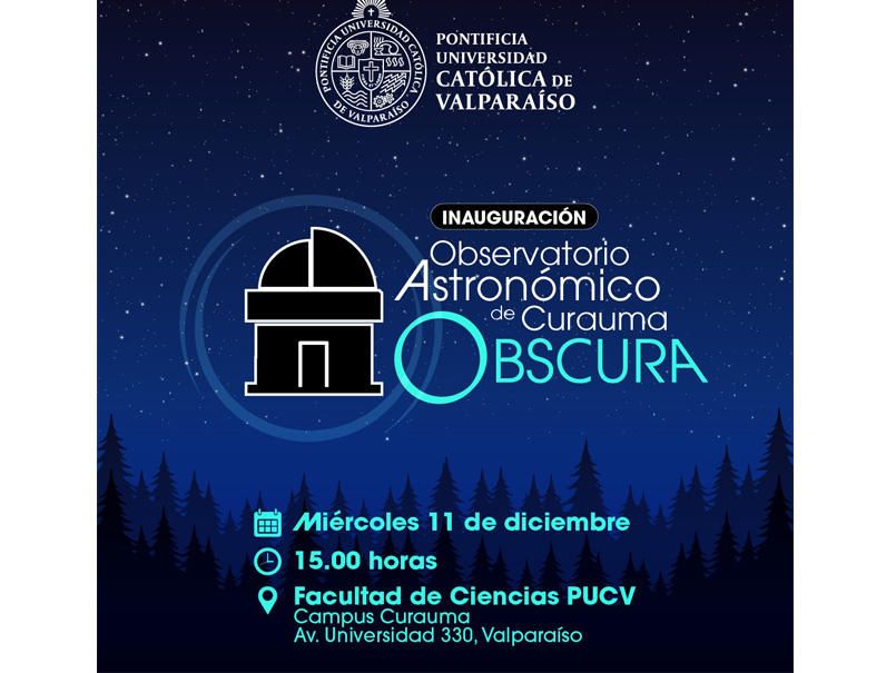 El miércoles 11 de diciembre, a las 15 horas, se realizará la inauguración del Observatorio Astronómico de Curauma (OSCURA) del Instituto de Física de la Pontificia Universidad Católica de Valparaíso, en el quinto piso del Edificio de Ciencias del Campus Curauma (Avenida Universidad 330, Curauma).