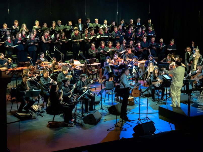Around 100 artists filled the stage at the Viña del Mar Municipal Theatre to present the “New chilean song” concert, led by the PUCV Orquesta Andina, the Chamber Choir and the Student Choir of the Music Institute (IMUS), who gathered under the direction of Félix Cárdenas to perform unforgettable works by Violeta Parra, Víctor Jara and Patricio Manns, among other emblematic national musicians.