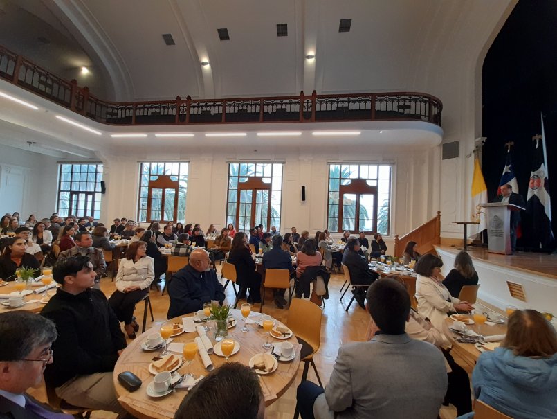 Al respecto, el Gran Canciller de la Universidad y Obispo de Valparaíso, Monseñor Jorge Patricio Vega Velasco svd, efectuó una presentación en el Salón de Honor donde expuso sobre los nuevos desafíos que enfrentan los colegios en tiempos complejos e hizo un llamado a cultivar la esperanza y la alegría.