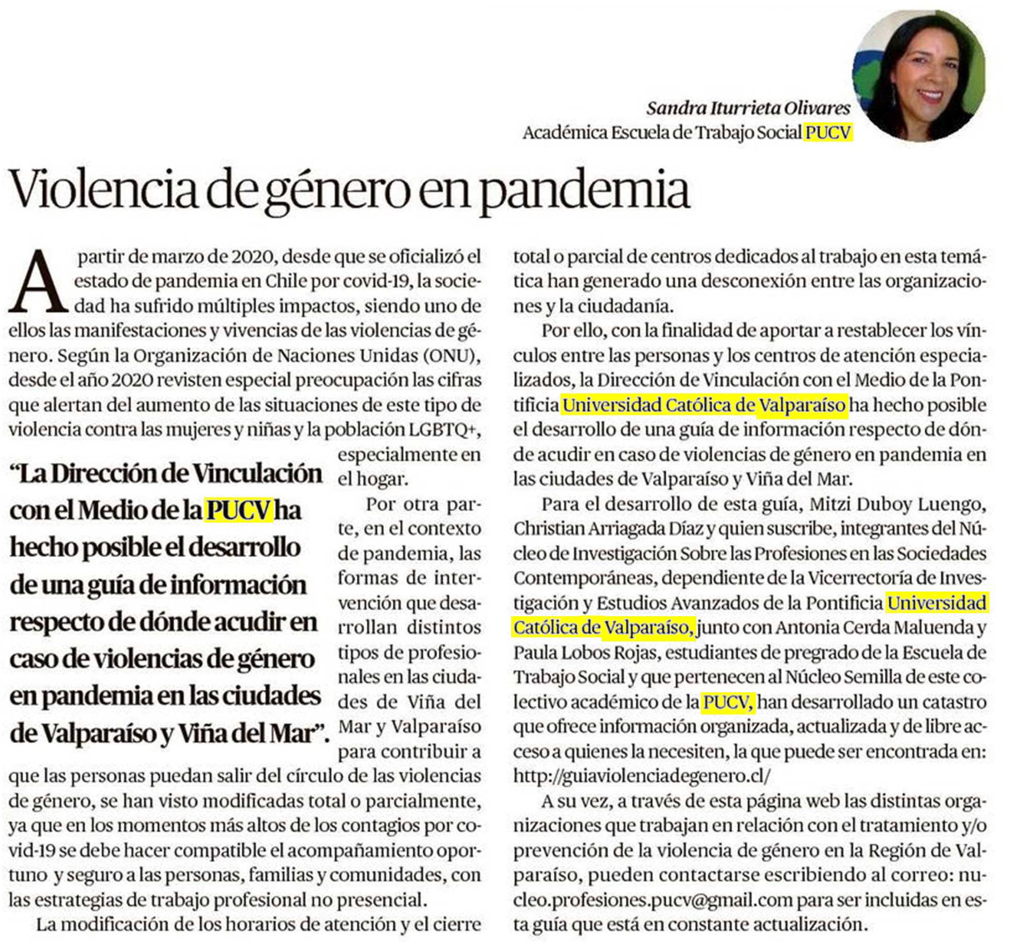 Por ello, con la finalidad de aportar a restablecer los vínculos entre las personas y los centros de atención especializados, la Dirección de Vinculación con el Medio de la Pontificia Universidad Católica de Valparaíso ha hecho posible el desarrollo de una guía de información respecto de dónde acudir en caso de violencias de género en pandemia en las ciudades de Valparaíso y Viña del Mar.