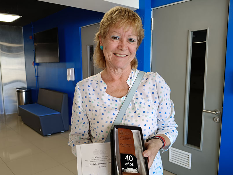 María Begoña Garay, secretaria del Decanato de la Facultad de Filosofía y Educación, que cuenta con una larga trayectoria y años de servicio dedicados a la Institución, recibió la distinción por parte de la Pontificia Universidad Católica de Valparaíso, por sus 40 años de servicio a la Universidad, siendo destacada por su dedicación y compromiso.
