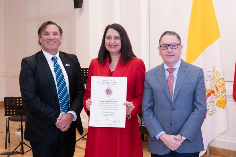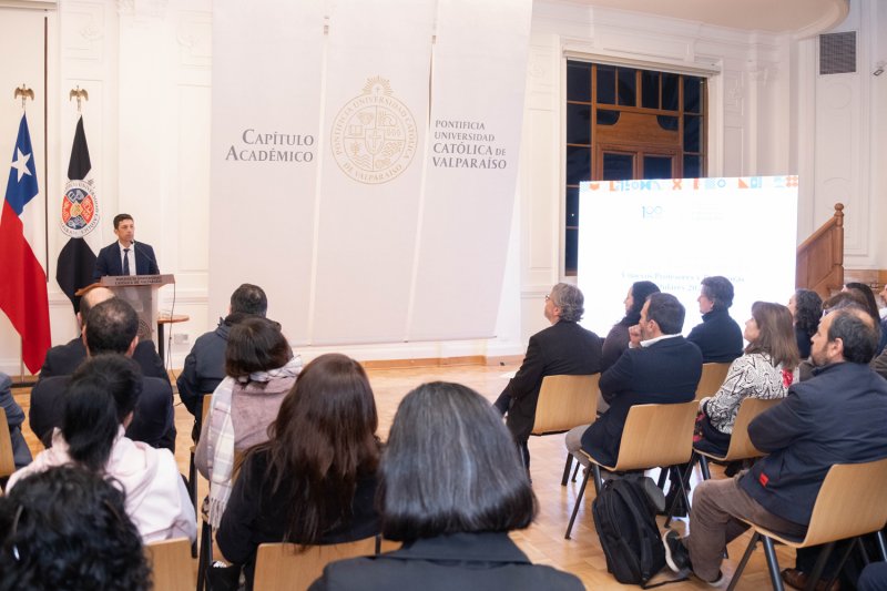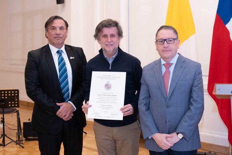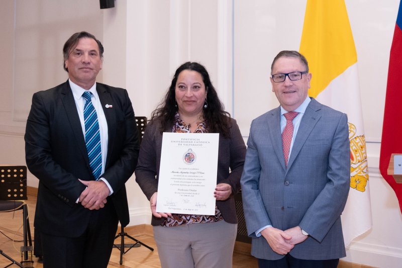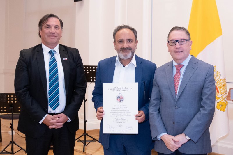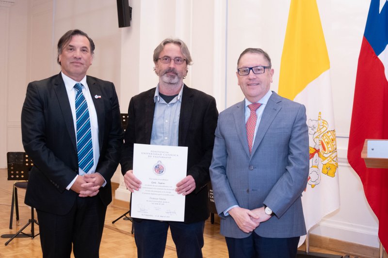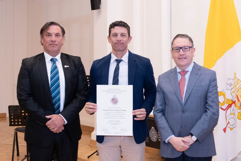 En la Casa Central de la PUCV se celebró una ceremonia para reconocer a siete nuevos profesores titulares: Radu Saghin (Instituto de Matemáticas), Marcela Cornejo (Escuela de Ciencias del Mar), Andoni Arenas (Instituto de Geografía), Carmen Núñez (Escuela de Psicología), Carolina Astudillo (Escuela de Alimentos), Juan Carlos Jeldes (Escuela de Arquitectura y Diseño) y Fernando Rodríguez (Escuela de Educación Física).