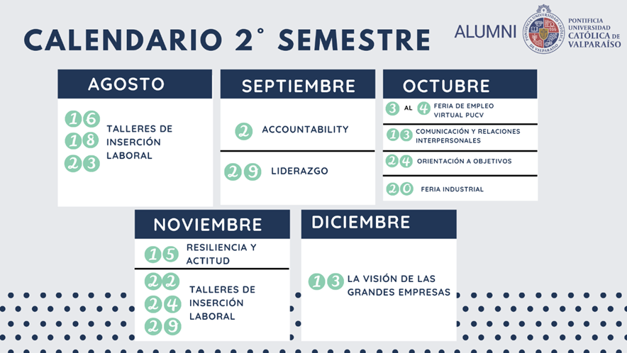 Con el objetivo de fortalecer la relación entre ex alumnos/as y la Pontificia Universidad Católica de Valparaíso, Red Alumni elaboró un nutrido calendario de actividades para este segundo semestre 2022.