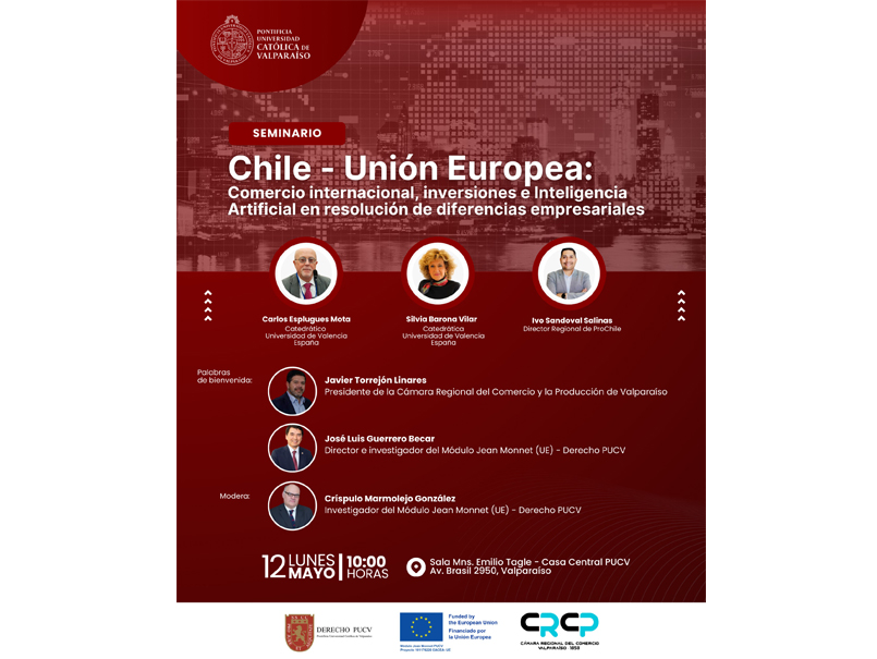 El proyecto “Módulo Jean Monnet" de la Escuela de Derecho de la PUCV y la Unión Europea realizarán el lunes día 12 de mayo, a las 10 horas en la Obispo Sala Emilio Tagle de Casa Central (Avenida Brasil 2950, Valparaíso), el seminario “Chile-Unión Europea: Comercio Internacional, inversiones e Inteligencia Artificial en resolución de diferencias empresariales” un encuentro que contará con la participación de los profesores españoles Carlos Esplugues y Silvia Barona, y del director regional de ProChile, Ivo Sandoval, y la moderación del profesor de la Escuela de Derecho Críspulo Marmolejo.