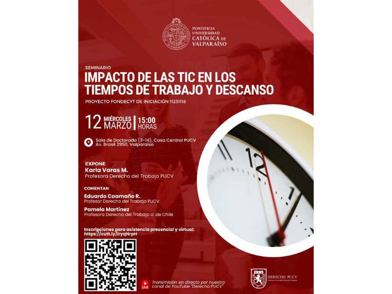 La Escuela de Derecho de la PUCV invita a la comunidad universitaria a asistir este miércoles 12 de marzo al Seminario “Impacto de las TIC en los tiempos de trabajo y descanso”.