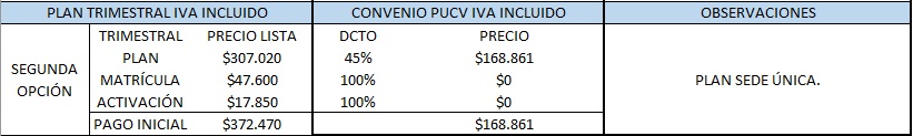 Plan de pago directo por los 3 meses, donde el pago único y total puede ser realizado con tarjeta de crédito en 3 cuotas, débito o transferencia. El titulado debe elegir sólo una sede, que puede ser Valparaíso, Viña del Mar o Montemar.