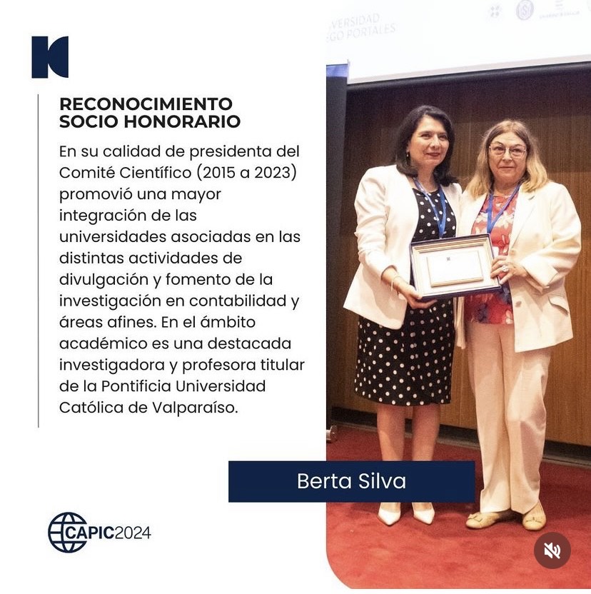 Nos enorgullece, además, comunicar la distinción otorgada a nuestra profesora Berta Silva, quien, en su calidad de presidenta del Comité Científico, promovió durante 8 años la integración de distintas universidades en las actividades de divulgación y fomento de la investigación en el campo de la contabilidad.
