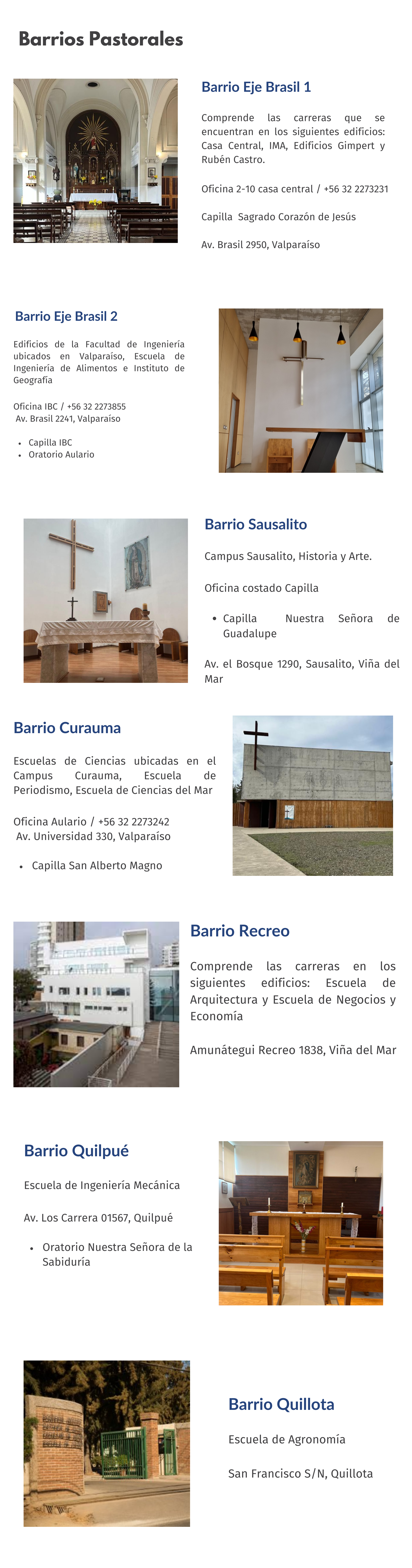 Los barrios pastorales, son “unidades territoriales en las cuales se agrupan distintas sedes de la PUCV, donde la Pastoral desarrolla su misión, de manera descentralizada e interdisciplinaria”.
