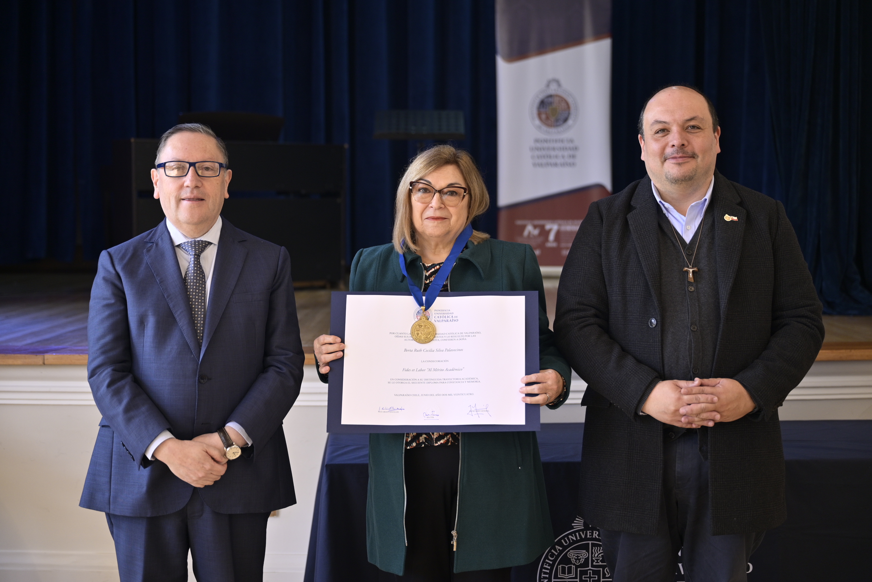 En esta ocasión, la profesora Berta Silva Palavecinos, obtuvo el reconocimiento a su trayectoria en la Universidad, junto a otros académicos de diferentes Escuelas. Mencionó que fue difícil en un comienzo lograr visibilidad en un mundo de hombres. “Recibir esta medalla de Fe y Trabajo es muy valioso. Esta es mi Alma Mater, aquí me he formado, he crecido, continué estudiando y recibí un gran apoyo. Más de la mitad de mi vida la he pasado en la Universidad. Siempre he querido transmitir conocimientos y compartir lo aprendido. Lo logré a través de la docencia. Cuando uno hace las cosas con pasión, tienen que salir bien”, añadió.