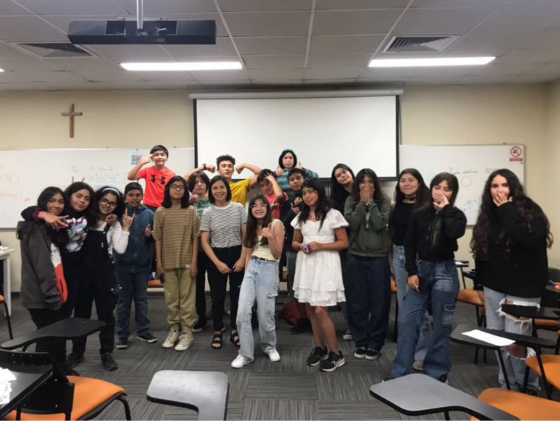 Descripción de imagen. Grupo de estudiantes de Temporada Académica de Verano posan, sonriendo a la cámara, junto a su profesora.