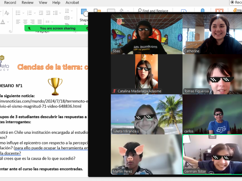 Descripción de imagen: Captura de pantalla a clase “Ciencias de la Tierra: conociendo el lugar que habitamos”. Está profesora junto a 7 estudiantes que sonríen y/o emplean efectos de plataforma Zoom para fotografía.