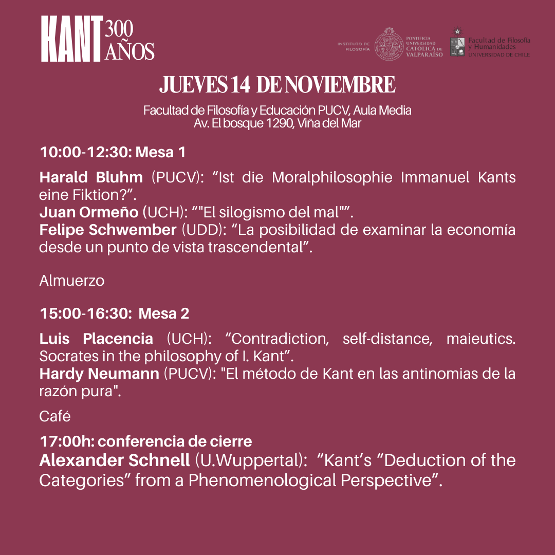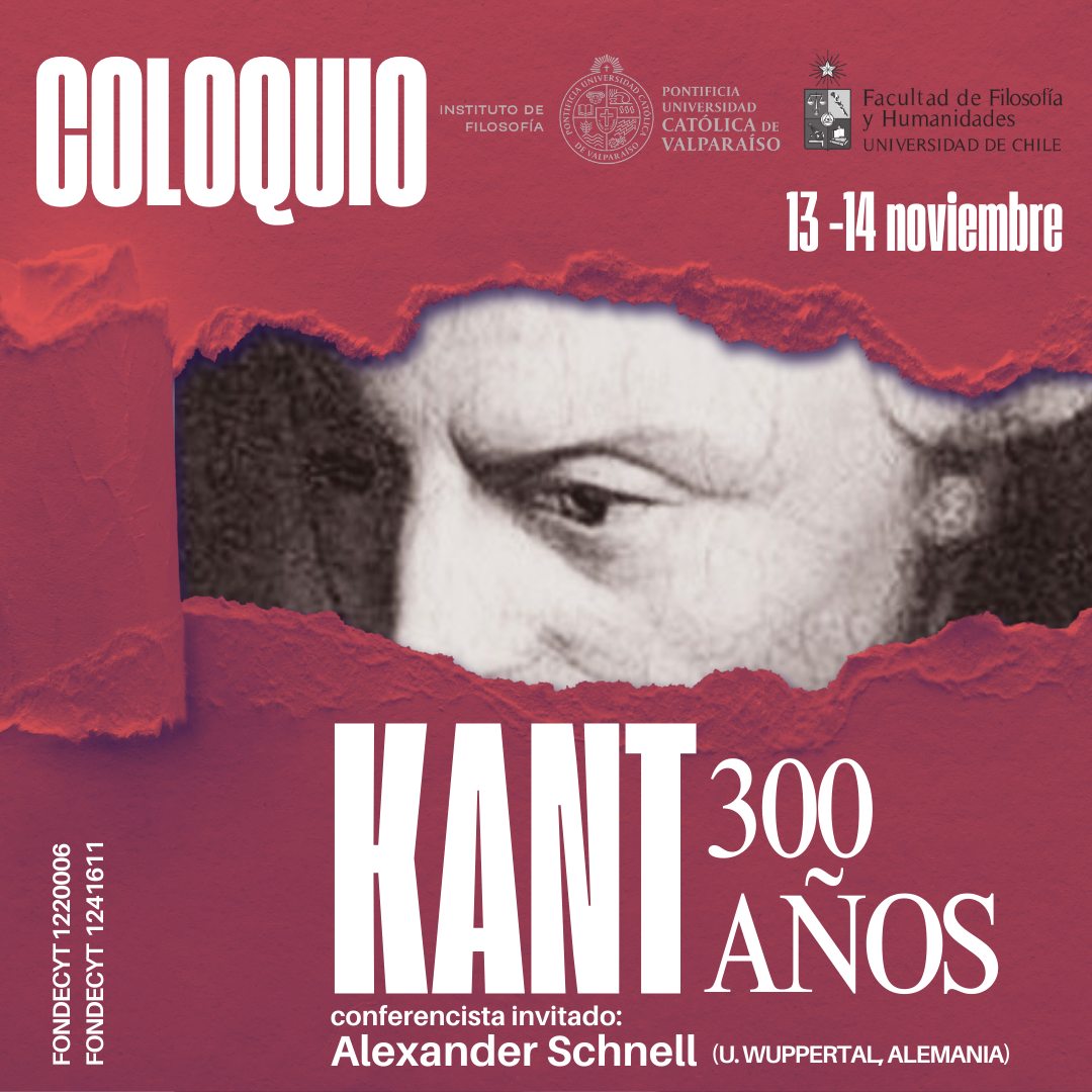 El Instituto de Filosofía PUCV, en colaboración con la Facultad de Filosofía y Humanidades UCH, y el Instituto de Filosofía PUCV, invitan a toda la comunidad educativa a participar del coloquio "Kant, 300 años". El encuentro, organizado en el marco de los proyectos FONDECYT N° 122006 y N° 1241611 tendrá lugar los días 13 y 14 de noviembre, y tendrá como conferencista invitado al prof. Dr. Alexander Schnell.