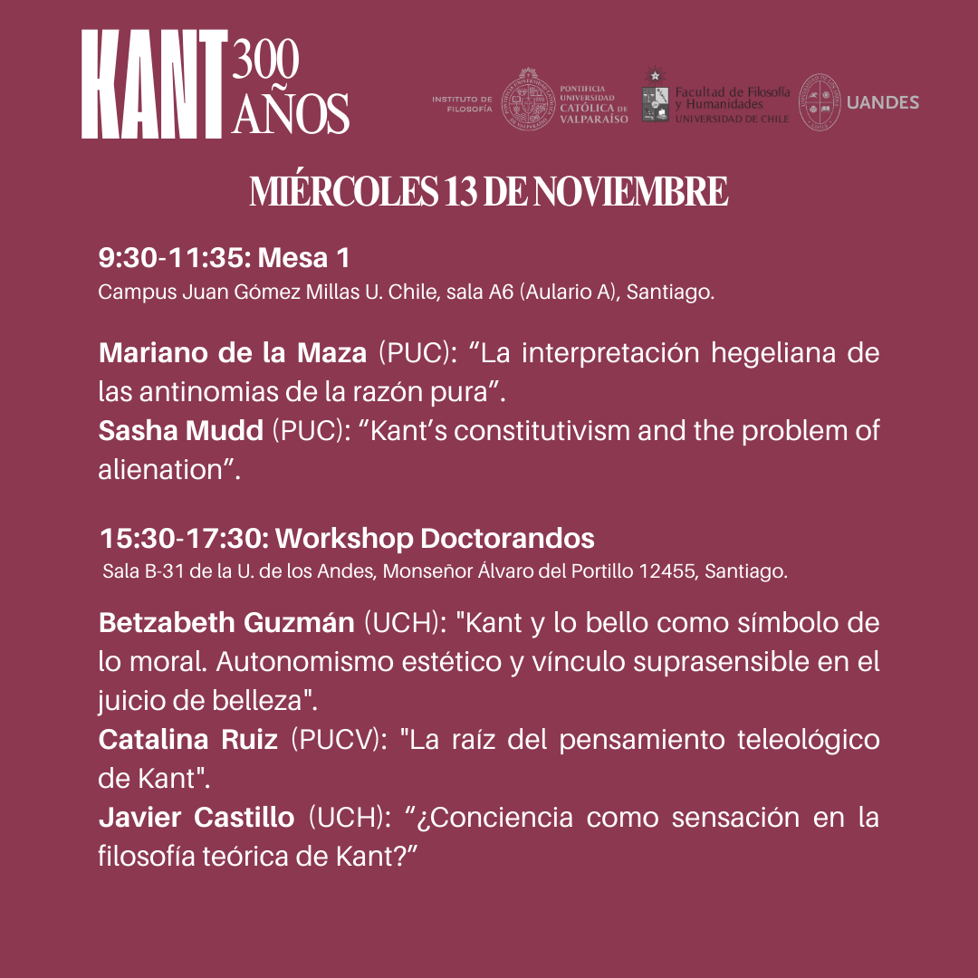 El día miércoles 13 la jornada comenzará en el Campus Juan Gómez Millas de la Universidad de Chile con la mesa 1 a las 09:30hrs, y seguirá en la tarde con el Workshop de Doctorandos en la Universidad de los Andes desde las 15:30hrs. El Coloquio continuará el día jueves 14 en la Facultad de Filosofía y Educación PUCV desde las 10:00hrs.
