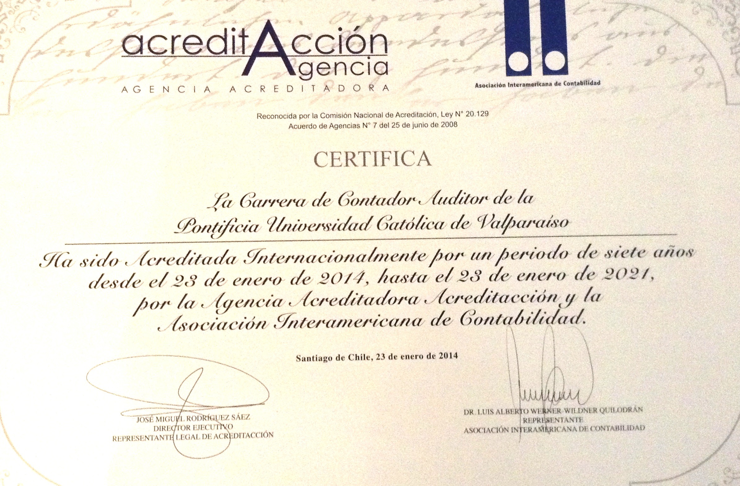 Por su parte la carrera de Contador Auditor de la PUCV está acreditada por 7 años (Agencia Acreditadora Acreditacción), cantidad máxima de años otorgada en nuestro país, siendo la única con el máximo de años a nivel nacional. Cabe mencionar además que posee una acreditación internacional de la Asociación Interamericana de Contabilidad.