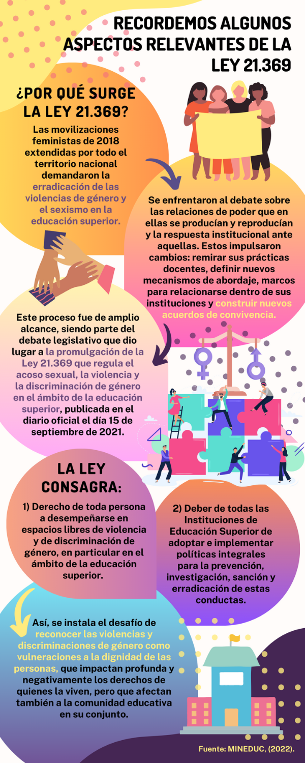 Es por esto que te invitamos a revisar un breve recordatorio de cómo surge esta ley, en base al texto “Orientaciones para los procesos de implementación de políticas integrales que abordan acoso sexual, violencia y discriminación de género en Educación Superior” desarrollado por la Subsecretaría de Educación Superior del Ministerio de Educación, documento publicado en septiembre de 2022 a un año de su entrada en vigencia.