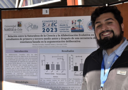 Comenta Nicolás que este trabajo de investigación corresponde a su tesis de pregrado, “Junto a Daniela Jaime, con quien realizamos esta investigación bajo la guía del profesor Hernán Cofré, estamos muy orgullosos. Nos alegró saber que a los asistentes les interesó nuestro estudio, ha sido una alegría que sentimos como valoración al esfuerzo depositado en la investigación realizada. Creo que la investigación llamó la atención debido a que es sobre dos temáticas de gran relevancia en la didáctica de las ciencias, la alfabetización científica y la naturaleza de la ciencia, y cómo se relacionan ambas en los estudiantes, sobre lo cual aún no hay suficiente evidencia empírica, por lo que nuestro aporte buscó entregar antecedentes empíricos sobre esta relación” (Más información en www.bioeducanos.cl).