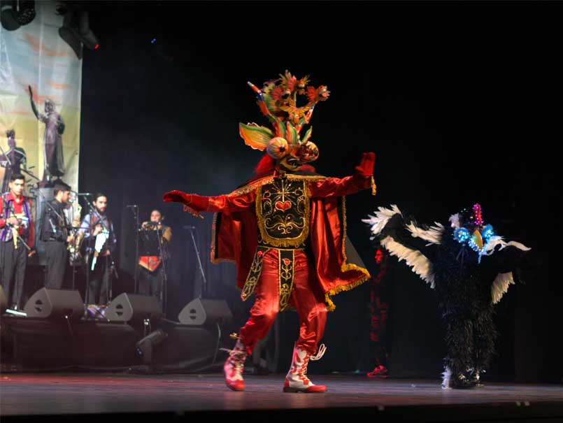 El elenco -fundado en 1974 por la Premio Nacional de Artes y Doctora Honoris Causa de la Universidad, Margot Loyola, y el profesor e investigador Osvaldo Cádiz- presentó “Peregrinos del Tamarugal” ante un entusiasta público que disfrutó cada pasaje de la vibrante puesta en escena, y que nació como resultado de una investigación que realizó el Conjunto y que recrea los distintos momentos que viven los peregrinos a través de vistosos trajes, danzas, melodías y cantos.