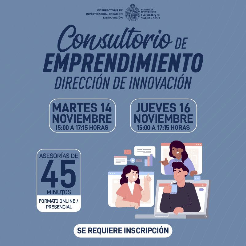 El Consultorio de Emprendimiento es una iniciativa de la Dirección de Innovación de la PUCV, que busca brindar un espacio para resolver dudas y recibir orientación sobre temáticas de innovación, emprendimiento y negocios, para acercar el conocimiento a la comunidad universitaria y también a emprendedores y emprendedoras de nuestra región. Estas consultorías personalizadas tienen una duración de 45 minutos y se desarrollarán en formato virtual o presencial, los siguientes días: