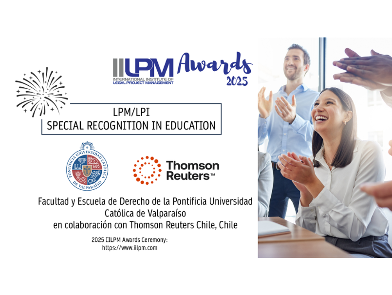 El pasado 1 de octubre, el Programa de Diplomado Legal Management Program, realizado por la Facultad y Escuela de Derecho PUCV en conjunto con Thomson Reuters, recibió el reconocimiento especial a la educación por parte del International Institute of Legal Project Management IILMP, en el marco de la Ceremonia de Entrega de los Premios IILMP 2025, instancia en la que el Instituto premia a los equipos legales reconocidos internacionalmente por su excelencia en la gestión de proyectos legales y éxitos en la mejora de procesos legales, que reunió a destacados profesionales del ámbito legal de distintos países.
