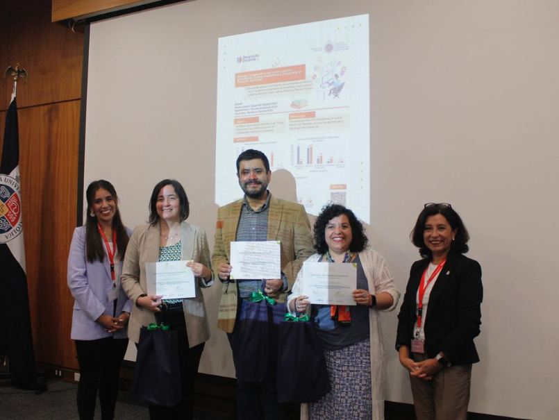 El primer lugar lo obtuvieron Pamela Catalán (Desarrollo Docente) y los académicos de Derecho PUCV, Sophía Romero y Oscar Silva, con el póster "Estudio comparativo de la percepción estudiantil: cursos tradicional y b-learning en Derecho procesal". Este puesto también recayó en Mariangella Camus, con el póster titulado "Precesión del chorro relativista en el cuásar nrao 530".