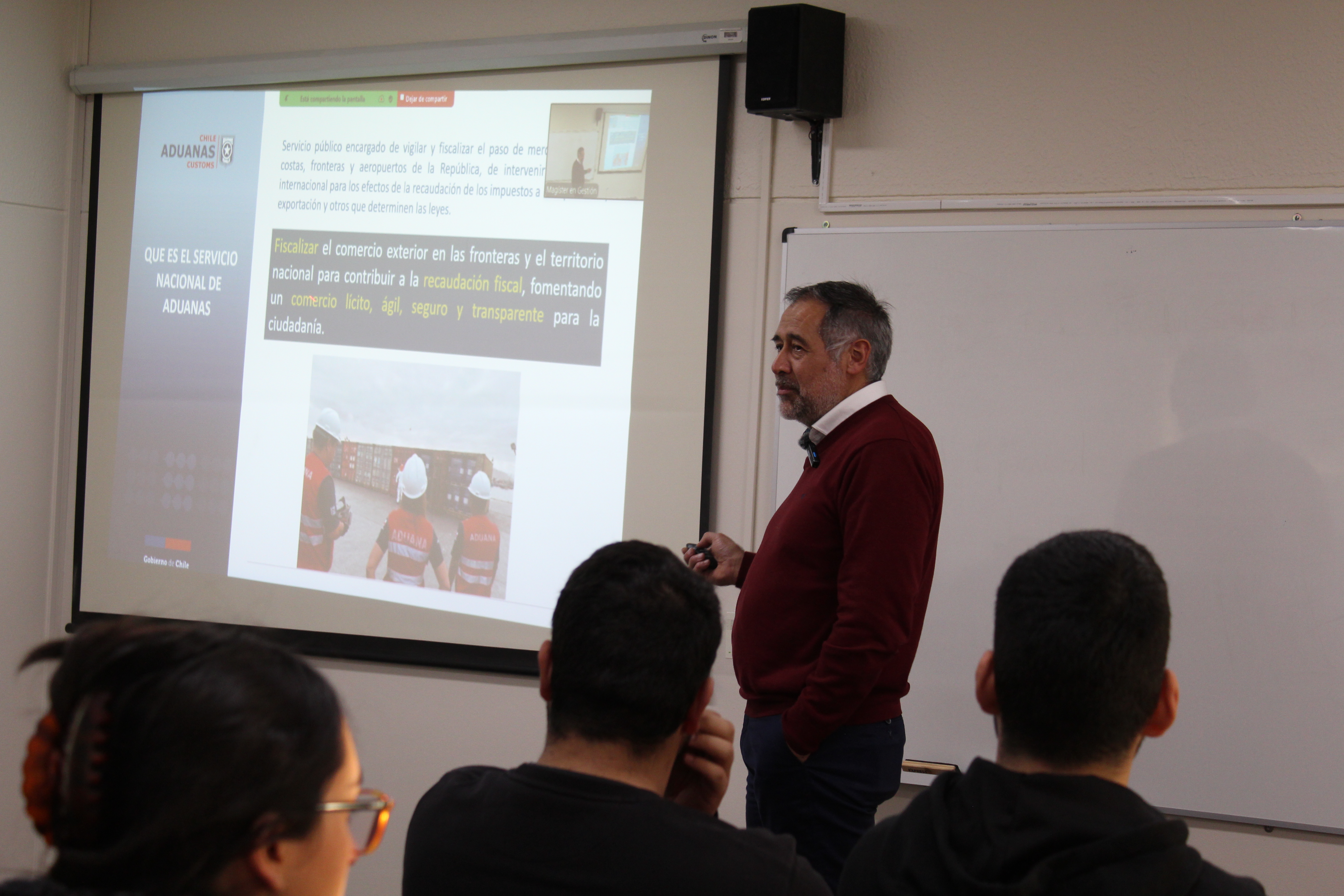El expositor comentó sobre su interés en estar presente en la Universidad para dar a conocer en profundidad los funcionamientos de la Aduana y contribuir a los conocimientos de los estudiantes presentes:"La verdad es que es una tremenda oportunidad, porque creo que una de las cosas que como sociedad, necesitamos fortalecer el conocimiento de nuestras instituciones. En caso particular de la Aduana, que tiene un rol súper amplio y que nosotros normalmente lo relacionamos con el señor que revisa las maletas en el aeropuerto, la verdad es que es mucho más que eso. Entonces para mi, es un tremendo espacio y oportunidad para poder contar a estudiantes y a futuros profesionales que van a desempeñarse en distintos ámbitos económicos"