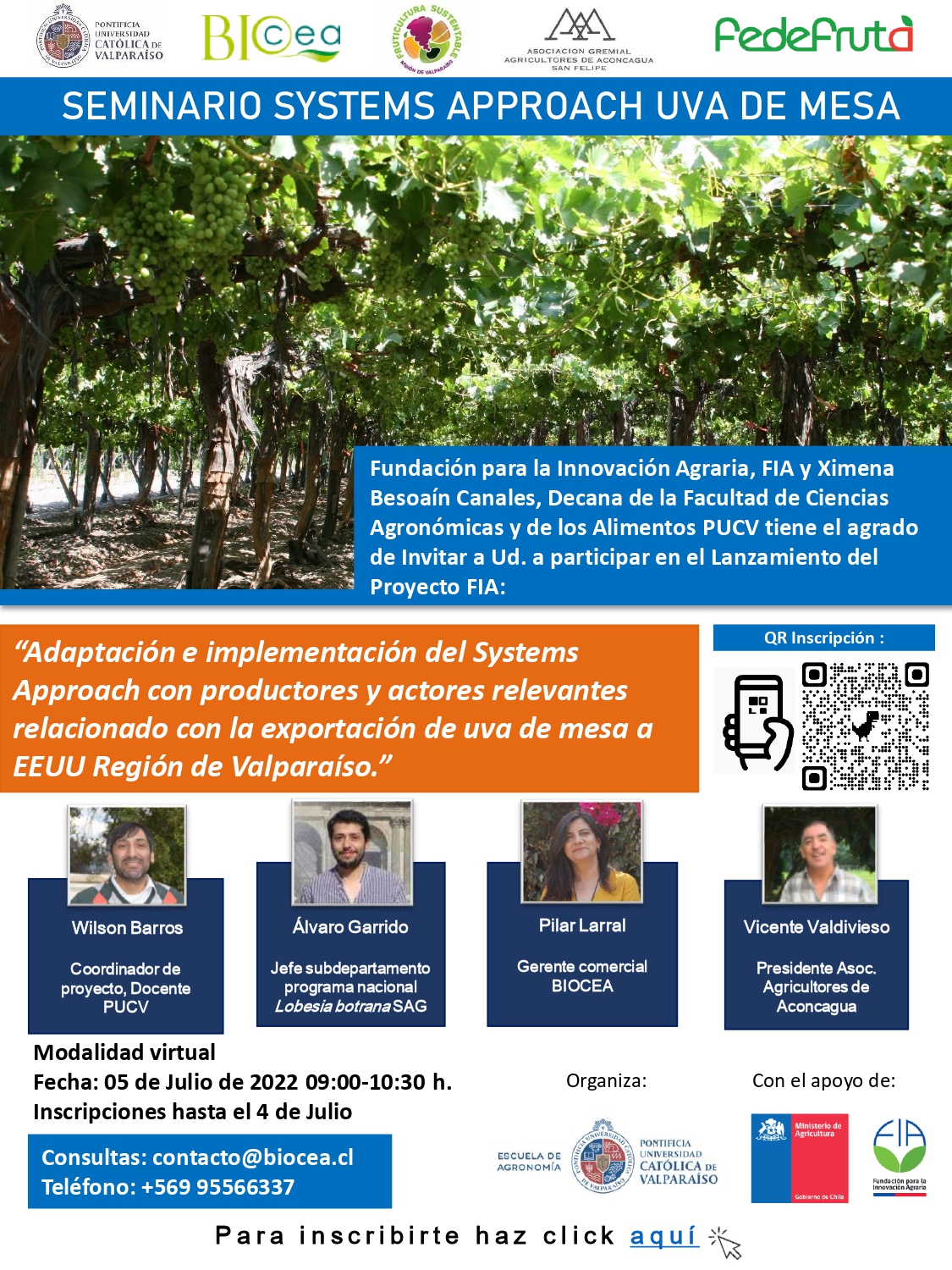 El lanzamiento de este importante proyecto contará con la presencia de la Decana de la Facultad de Ciencias Agronómicas y de los Alimentos, Ximena Besoain; el Jefe del Subdepartamento Programa Nacional Lobesia Botrana, SAG; el Coordinador del Proyecto e Investigador de la Escuela de Agronomía PUCV, Wilson Barros; la Gerente Comercial BIOCEA Ltda., Pilar Larral y el Presidente de la Asociación de Agricultores de San Felipe, Vicente Valdivieso.