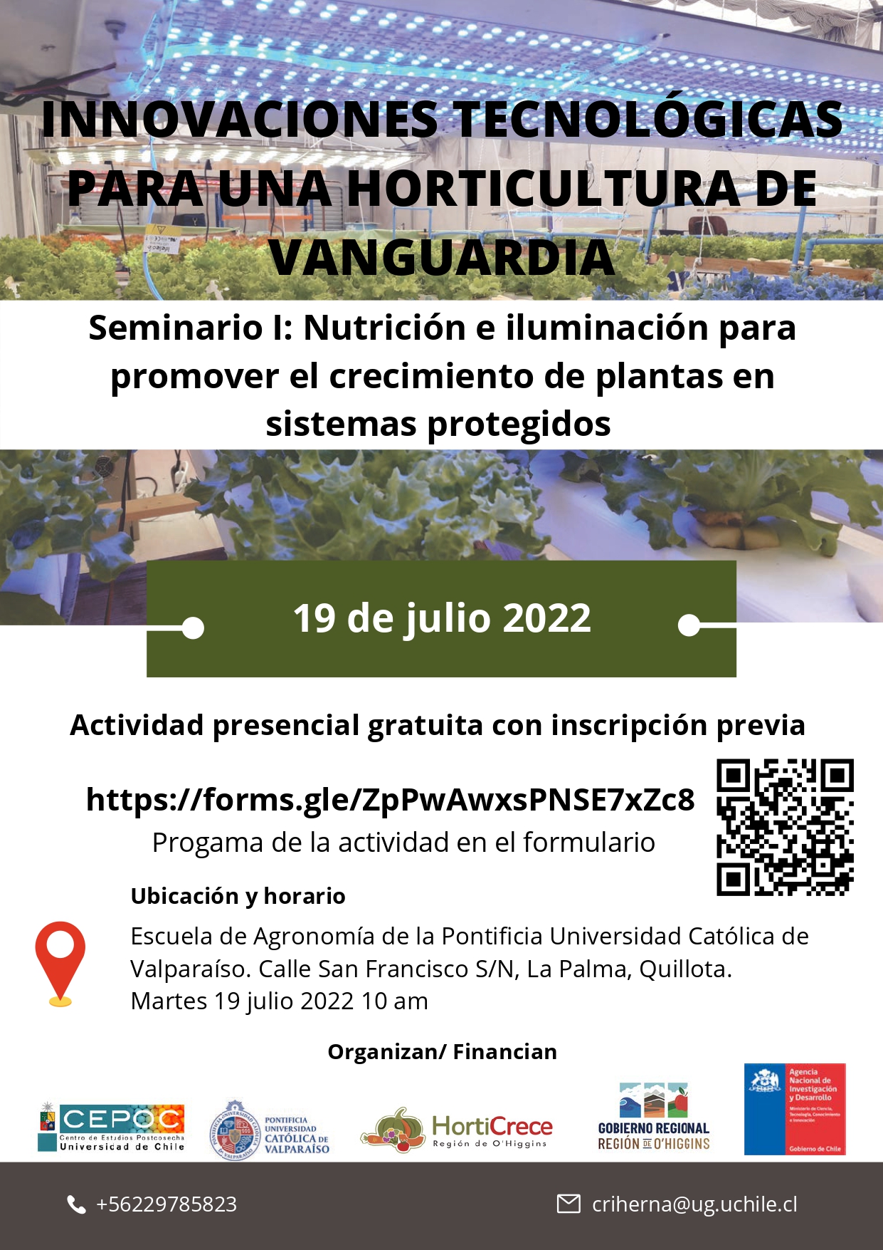 El martes 19 de julio a las 10:00 horas, se realizará el Seminario Nutrición e iluminación para promover el crecimiento de plantas en sistemas protegidos, el cual es el primero de la ronda de seminarios INNOVACIONES TECNOLÓGICAS PARA UNA HORTICULTURA DE VANGUARDIA.