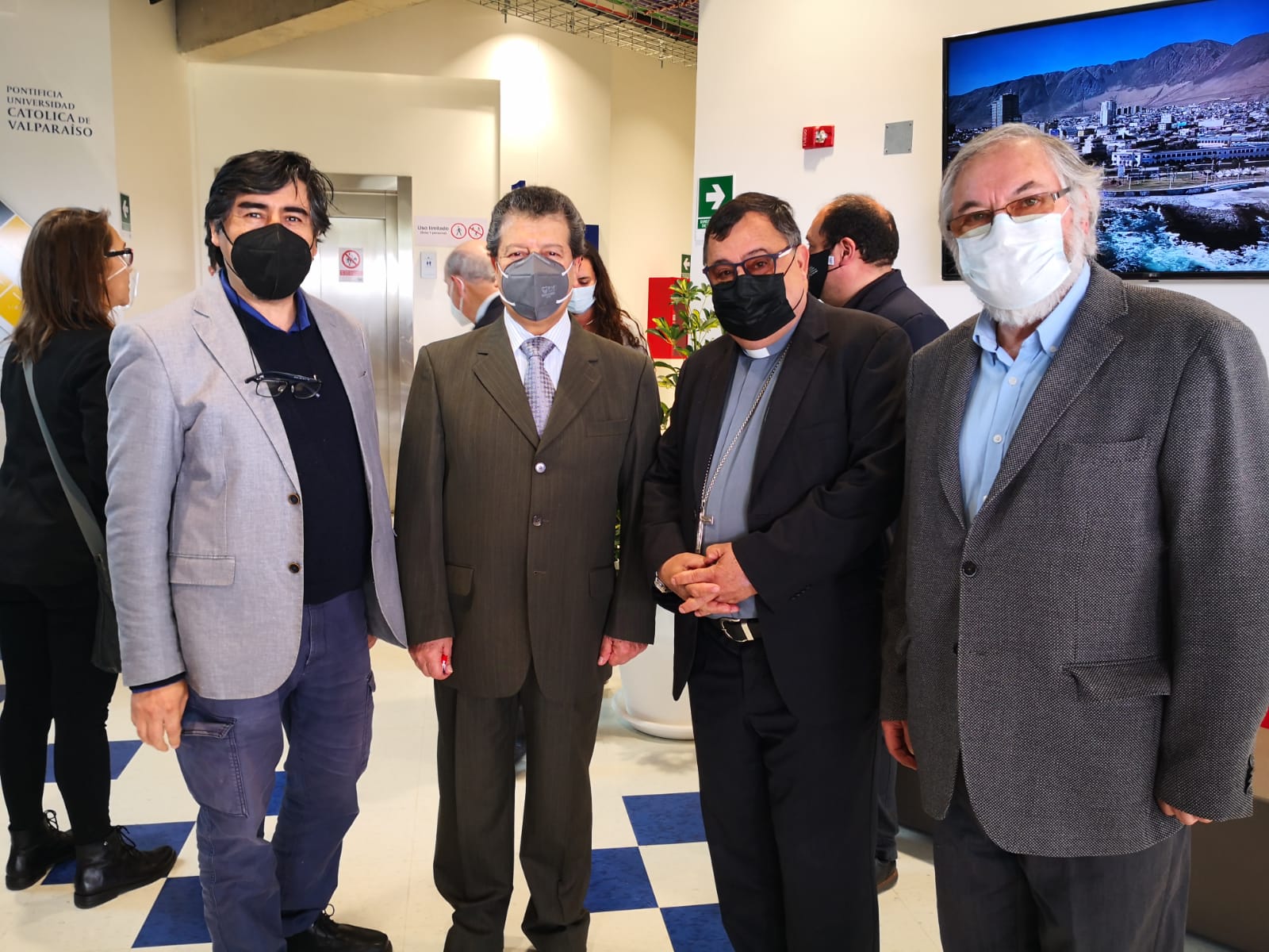El director Rodrigo Figueroa, en conjunto con los profesores Marcos Cisternas, el Obispo de Valparaíso y Gran Canciller de la Universidad, Mons. Jorge P. Vega Velasco svd y Jorge Negrete.