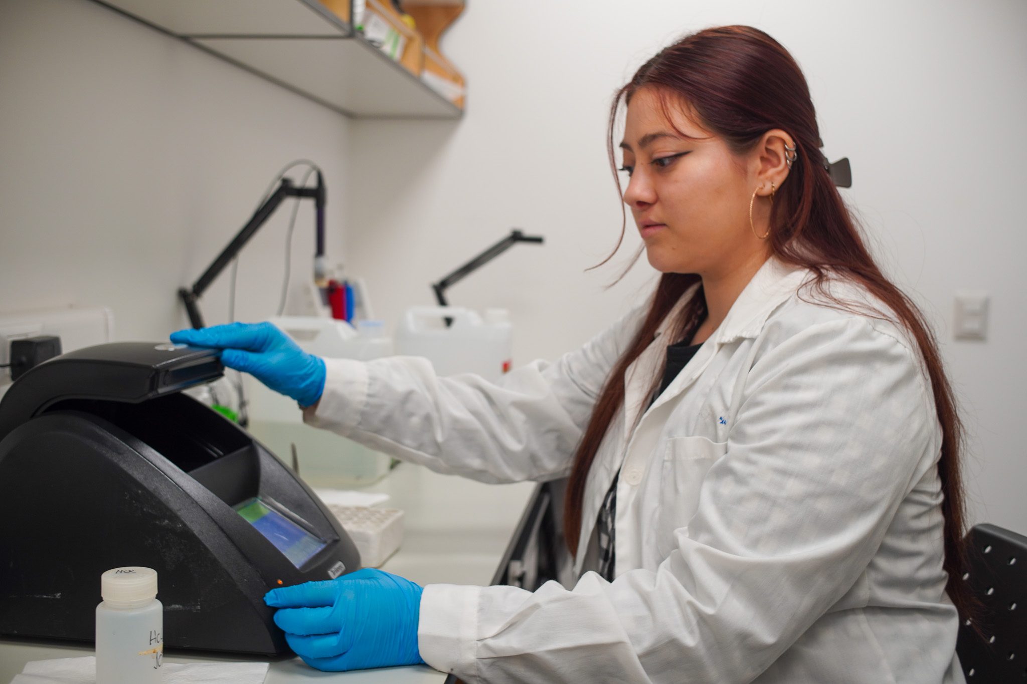 Guiada por la profesora Marcela Cornejo y la encargada de laboratorio, Paola Reinoso, la practicante tuvo la oportunidad de realizar muestreos en salidas a terreno, especializándose en el área de biogeoquímica.