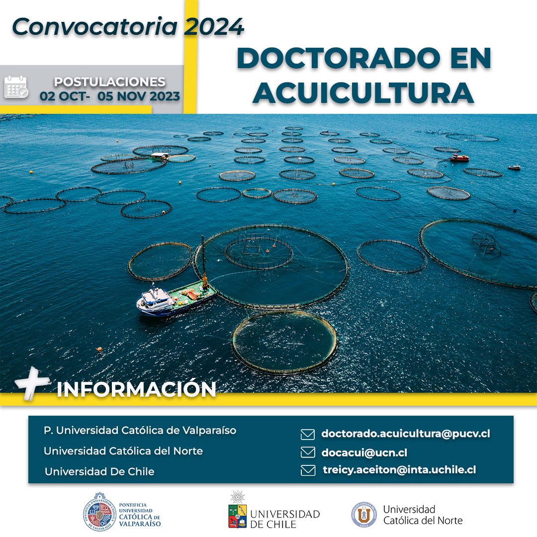 Entre los requisitos de postulación se exige rellenar este formulario de postulación, además de contar con documentos y referencias disponibles para su revisión desde este link. Las solicitudes de postulaciones se deben enviar con fecha plazo hasta el 5 de noviembre de 2023 con copia a los siguientes correos: docacui@ucn.cl (Universidad Católica del Norte); doctorado.acuicultura@pucv.cl (P. Universidad Católica de Valparaíso) o treicy.aceiton@inta.uchile.cl (Universidad de Chile).
