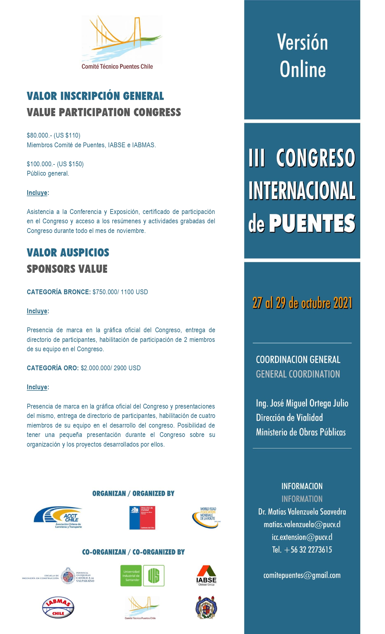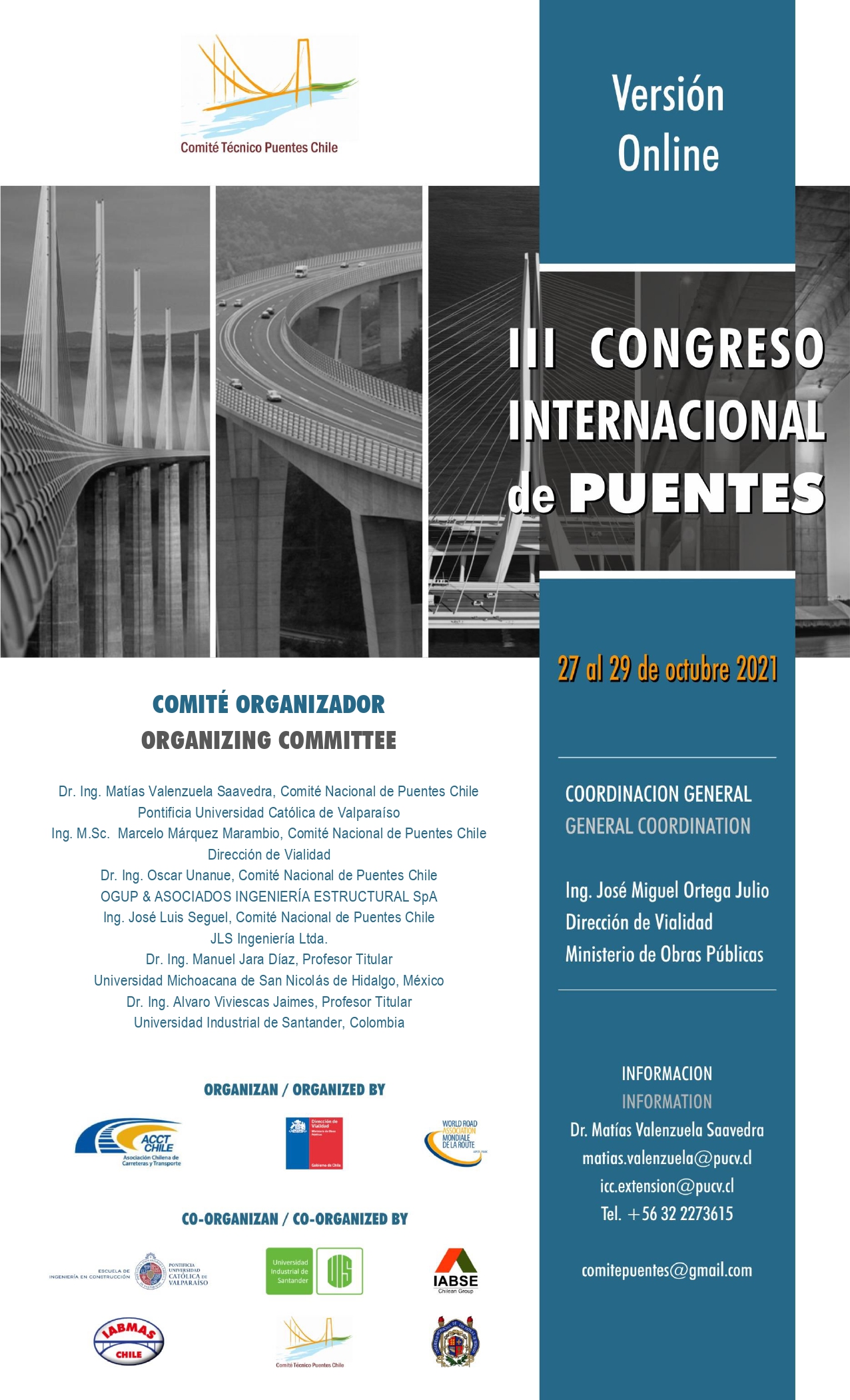 La Asociación Chilena de Carreteras y Transporte (ACCT Chile y el Comité Nacional Chile PIARC), en conjunto con la Escuela de Ingeniería en Construcción, Pontificia Universidad Católica de Valparaíso acordaron realizar el Tercer Congreso Internacional de Puentes- Chile 2021 (CIPCh), Futuros Desafíos: Diseño, Construcción y Mantención, durante los días 27, 28 y 29 de octubre de 2021, de forma Online como parte de las actividades internacionales del "Comité Técnico de Puentes de Chile". Adicionalmente, en esta oportunidad el evento incluye el VI Simposio Internacional, - Diseño y Construcción de Puentes, organizado por la Pontificia Universidad Católica de Valparaíso, la Universidad Michoacana de San Nicolás de Hidalgo, México y la Universidad Industrial de Santander, Colombia.