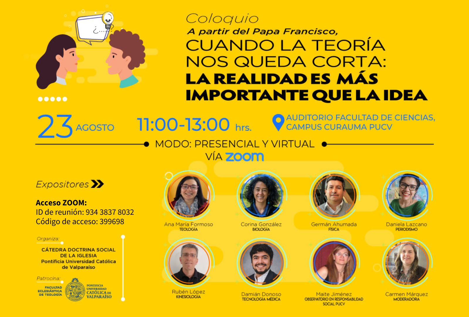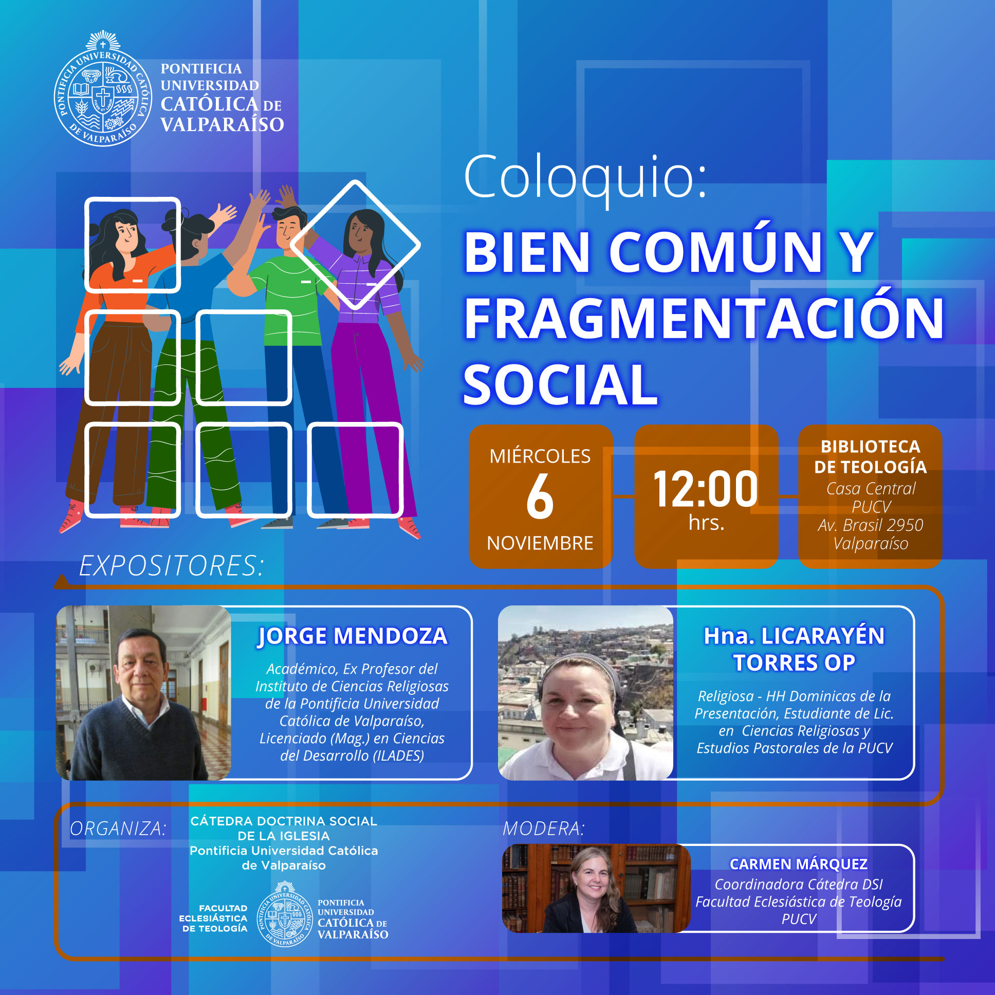La actividad invitó a participar a Jorge Mendoza, académico, ex profesor del Instituto de Estudios Religiosos de la PUCV, Licenciado (Mag.) en Ciencias del Desarrollo (ILADES); y a laHna. Licarayén Torres OP, religiosa - HH Dominicas de la Presentación, estudiante de Lic. en Ciencias Religiosas y Estudios Pastorales de la PUCV.