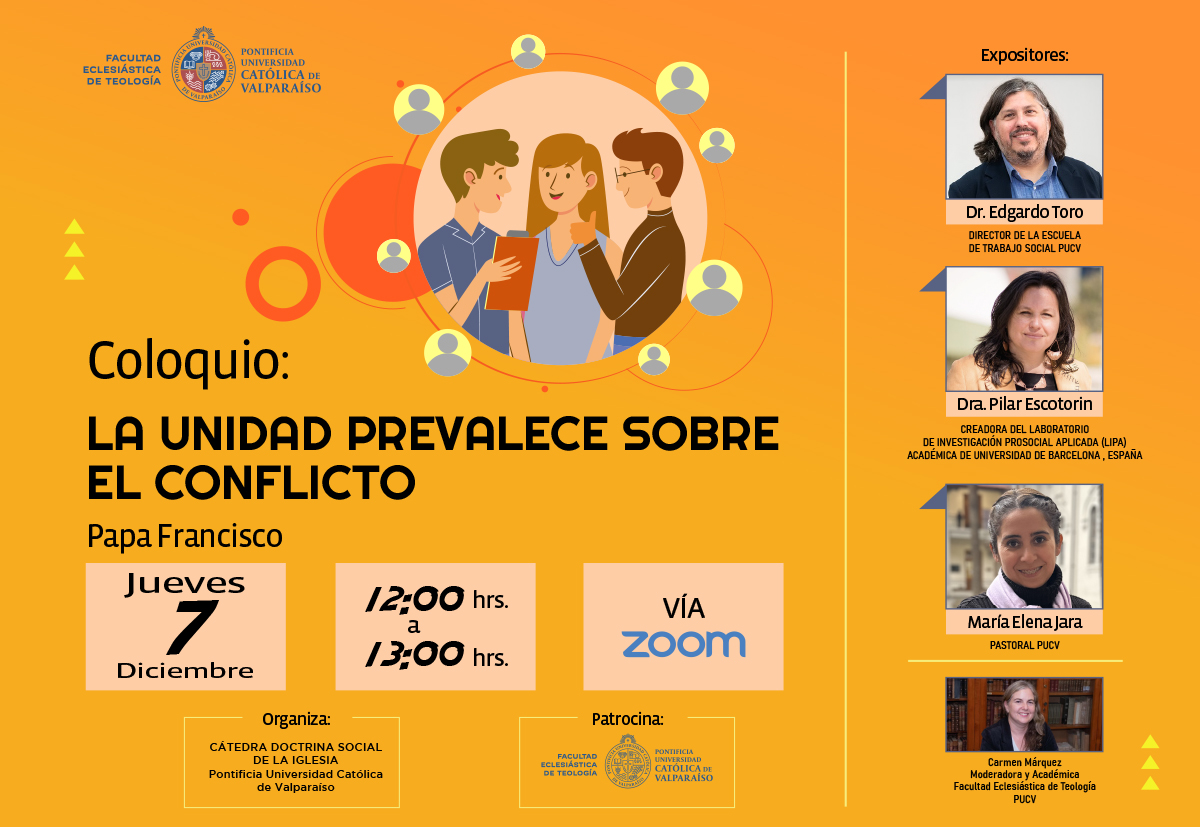 Con la participación de Soledad del Villar Tagle, licenciada en historia, magíster en historia Contemporánea UAH, magister en teología y doctoranda por la Universidad de Boston y Juan Richter, sociológo y secretario pastoral de la Vicaría Zona del Maipo en el Arzobispado de Santiago; el martes 29 de noviembre se realizó el coloquio 2022 de la Cátedra Doctrina Social de la Iglesia, titulado "Cultura del encuentro y del cuidado".