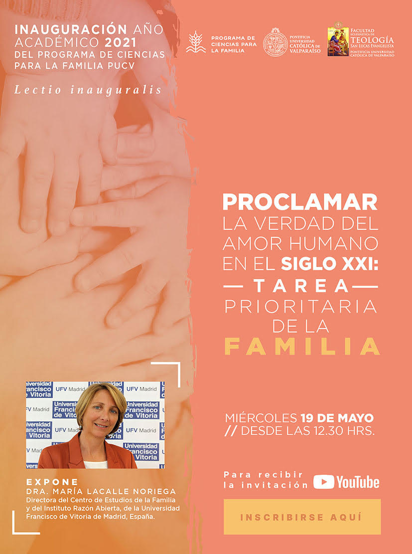 El miércoles 19 de mayo, a las 12.30 hrs., realizaremos la lectio inauguralis del Programa de Ciencias para la Familia de la PUCV. El título será: "Proclamar la verdad del amor humano en el siglo XXI: tarea prioritaria de la familia", a cargo de la Dra. María Lacalle Noriega, Directora del Centro de Estudios de la Familia y del Instituto Razón Abierta, de la Universidad Francisco de Vitoria de Madrid, España.