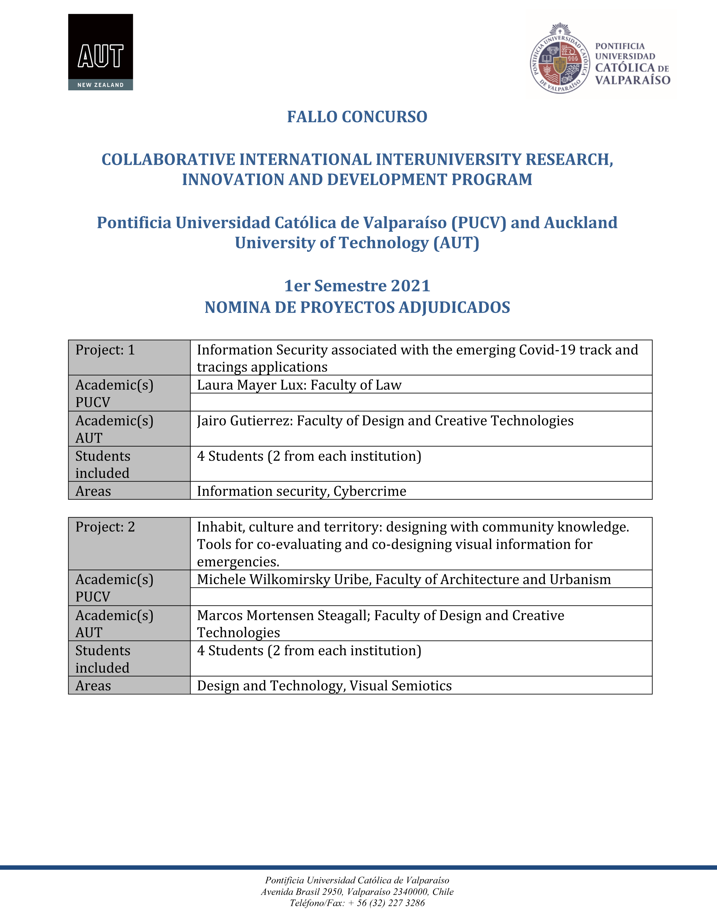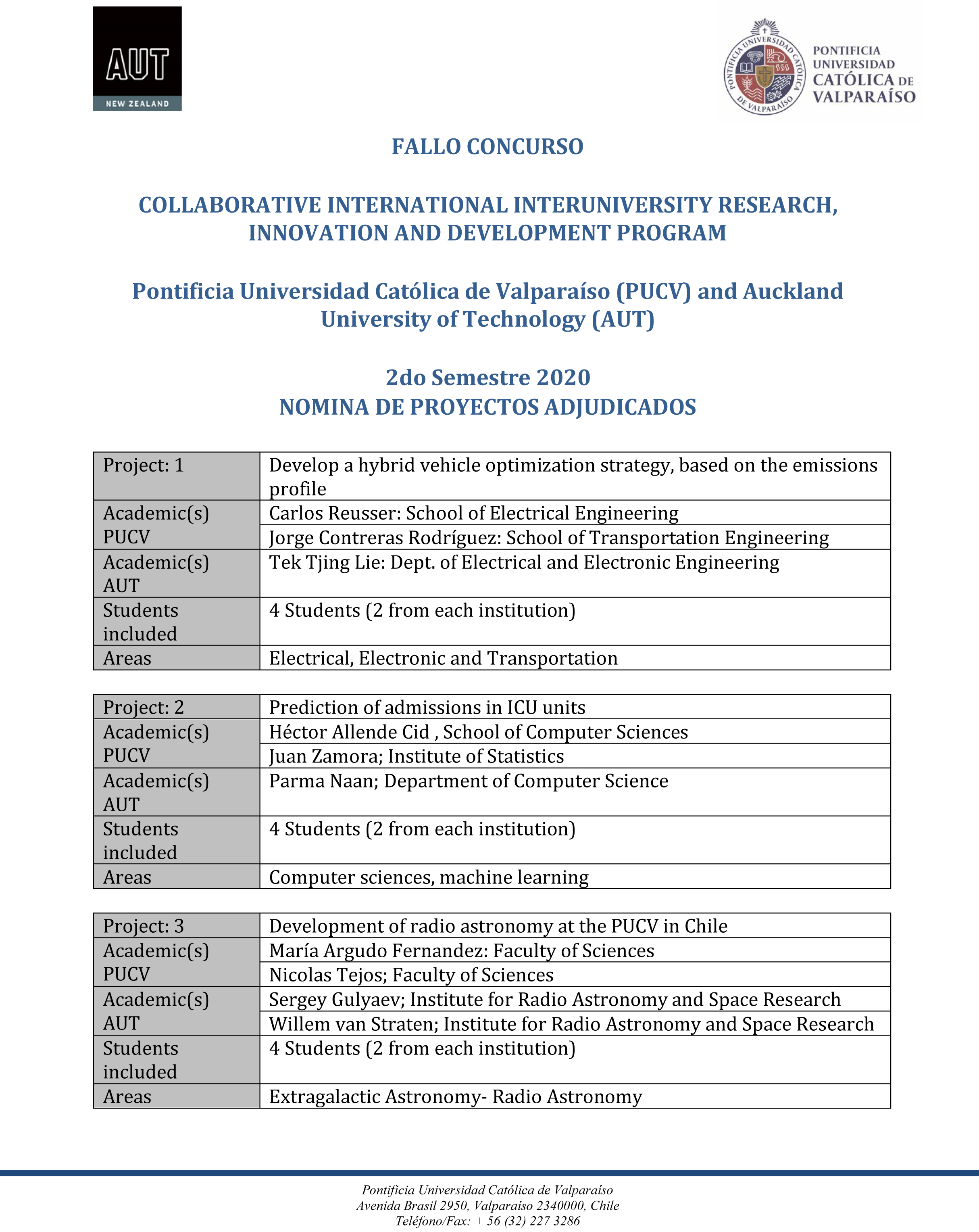A continuación, el fallo que detalla los proyectos adjudicados en el marco de los concurso PUCV-AUT: