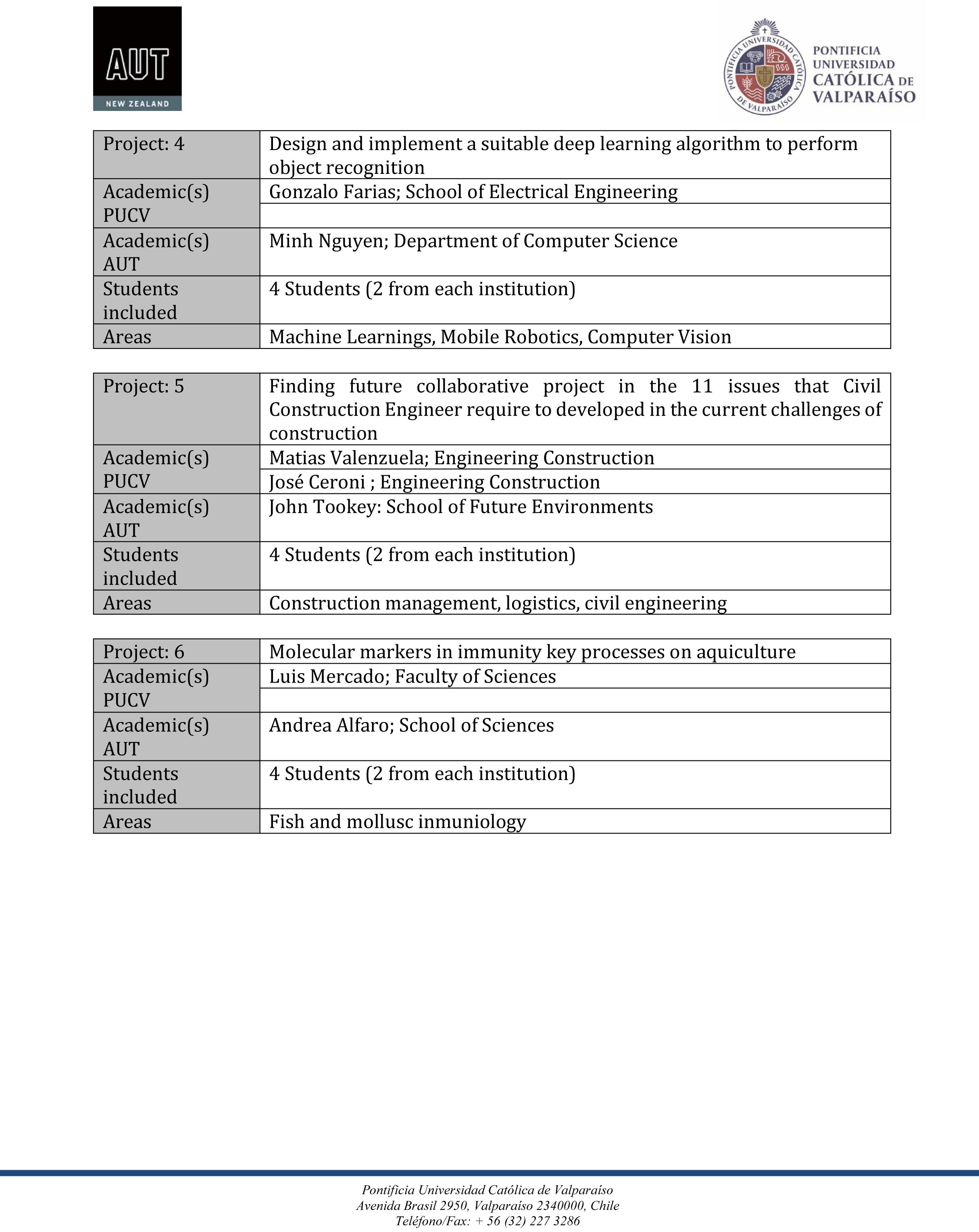 El Programa de colaboración internacional entre la Pontificia Universidad Católica de Valparaíso (PUCV) y la Auckland University of Technology (AUT), financia proyectos colaborativos de investigación, innovación y desarrollo tecnológico, en el marco del Programa de investigación e innovación internacional colaborativo interuniversidades: “CIIRID: IDEA”. Desde esta perspectiva, la generación de conocimiento colaborativo de los académicos de la Universidad junto a sus pares de AUT, se sustenta en la idea de asumir los desafíos comunes para educar a los futuros ciudadanos en una era de rápidos cambios sociales, ambientales y tecnológicos. Esta, ha sido la principal motivación para generar proyectos colaborativos de perfil de I + I + D, con potencial de ser financiados con fondos externos, incorporando académicos y estudiantes de ambas instituciones.
